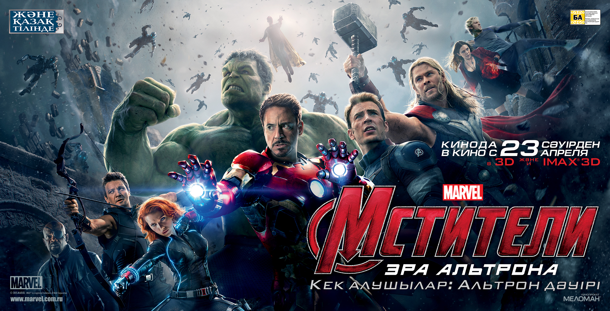 "Мстители: Эра Альтрона" стал 11-м фильмом, дублированным на казахский язык, и второй голливудской картиной, которая выйдет на казахском языке в 2015 году. Примечательно, что впервые был изготовлен постер с титрами на казахском языке.  Блокбастер "Мстители: Эра Альтрона" казахстанцы увидят раньше, чем в других странах мира, на неделю. Премьера состоится 23 апреля.