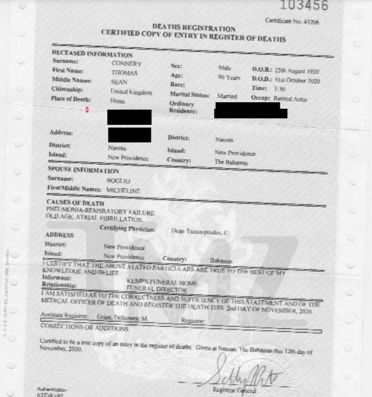 Свидетельство о смерти Шона Коннери. Фото: TMZ