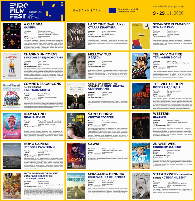 Жители Казахстана смогут бесплатно посмотреть 18 европейских фильмов после регистрации на сайте festivalscope.com. Фильмы демонстрируются на языке оригинала с субтитрами на русском и английском языках. Видеоинструкция для тех, кто хочет зарегистрироваться на сайте.