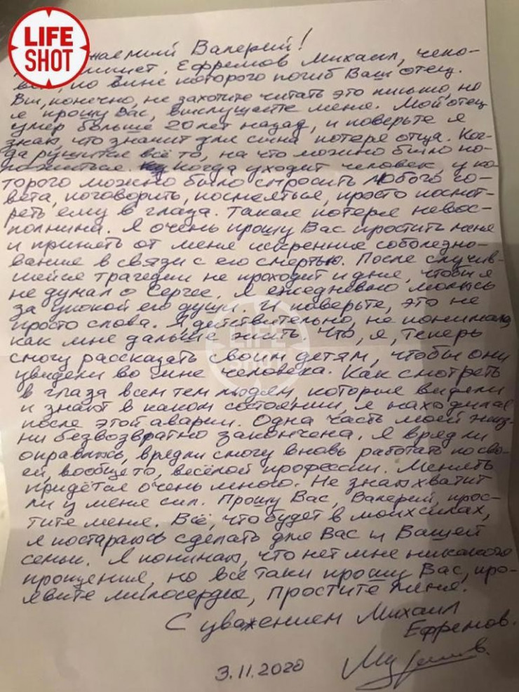 "Я вряд ли оправлюсь, вряд ли смогу вновь работать по своей вообще-то веселой профессии. Менять придется очень много. Не знаю, хватит ли у меня сил. Прошу вас, Валерий, простите меня. Все, что будет в моих силах, я постараюсь сделать для вас и вашей семьи. Я понимаю, что нет мне никакого прощения, но все-таки прошу вас, проявите милосердие, простите меня", - написал Ефремов.