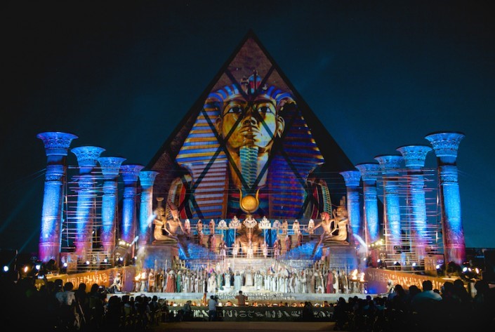 Есть прекрасное сооружение - Дворец мира и согласия, в народе "Пирамида". Имея такую великолепную естественную декорацию, было бы неправильно упустить эту возможность. Нам пришлось добавить только несколько деталей. В репертуаре театра "Астана Опера" имеется постановка оперы "Аида". Оркестр, балет, хор, солисты, готовые декорации. Радамес на колеснице в сопровождении конницы. Зрелище было потрясающее. До сих пор все послы высказывают свое восхищение, что в казахской степи оперу "Аида" поставили.