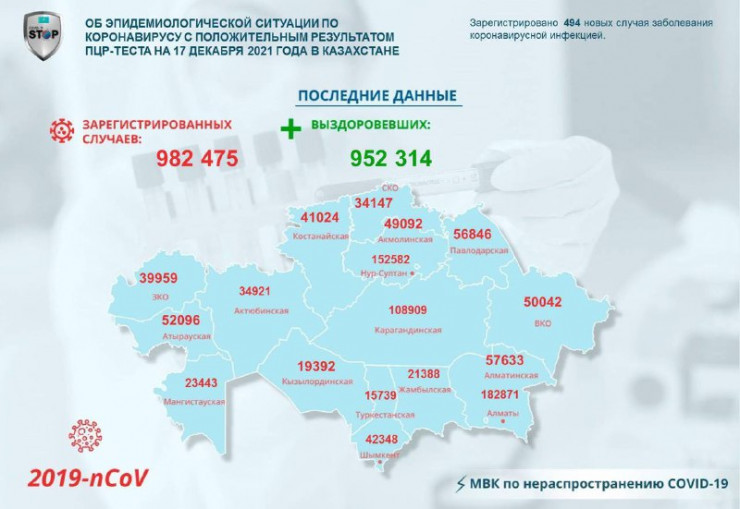 За прошедшие сутки (17 декабря) в Казахстане зарегистрировано 494 новых случая заболевания коронавирусной инфекцией, передает Tengrinews.kz со ссылкой на данные Межведомственной комиссии по нераспространению COVID-19.