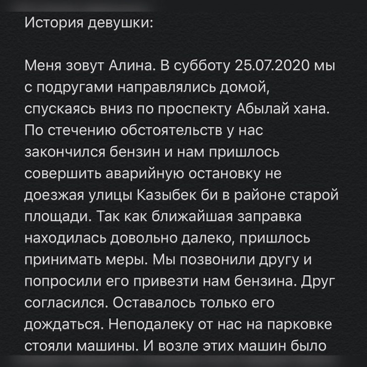 Инцидент произошел в субботу, 25 июля, на проспекте Абылай хана. У девушек закончился бензин, и они совершили вынужденную остановку близ улицы Казыбек би в районе Старой площади.
