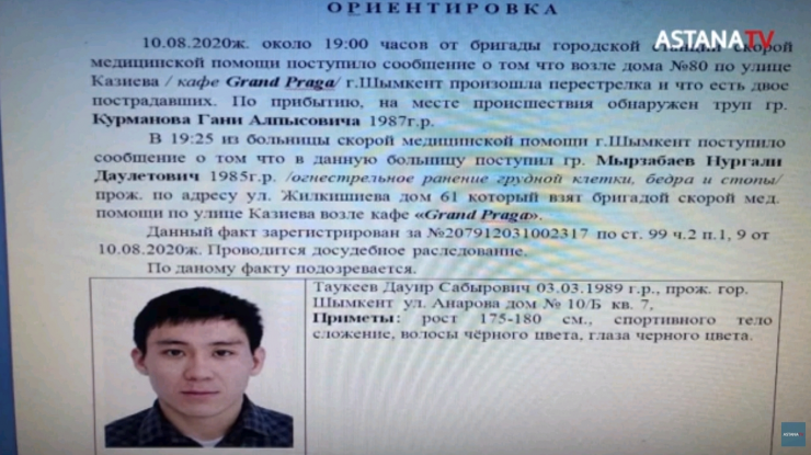 В информации говорится о розыске 31-летнего Дауира Таукеева. Там же указаны сведения о погибшем и пострадавшем.