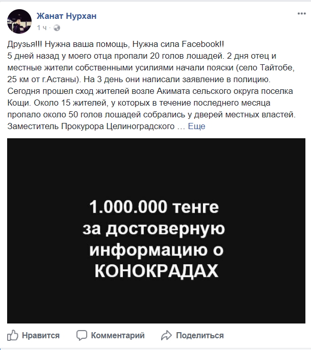 "Пять дней назад у моего отца пропали 20 голов лошадей. Два дня назад отец и местные жители собственными усилиями начали поиски (село Тайтобе, 25 километров от Астаны). На третий день они написали заявление в полицию. Сегодня прошел сход жителей возле акимата сельского округа поселка Косшы. Около 15 жителей, у которых в течение последнего месяца пропало около 50 голов лошадей, собрались у дверей местных властей. Заместитель прокурора Целиноградского района и начальник отделения полиции поселка Косшы ссылаются на нехватку сотрудников (полиции, участкового инспектора)",  - рассказал в социальной сети Facebook Жанат Нурхан.