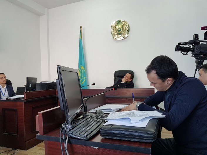 Судья Жаннат Бекжанов смотрит оперативное видео в суде. Фото Tengrinews.kz
