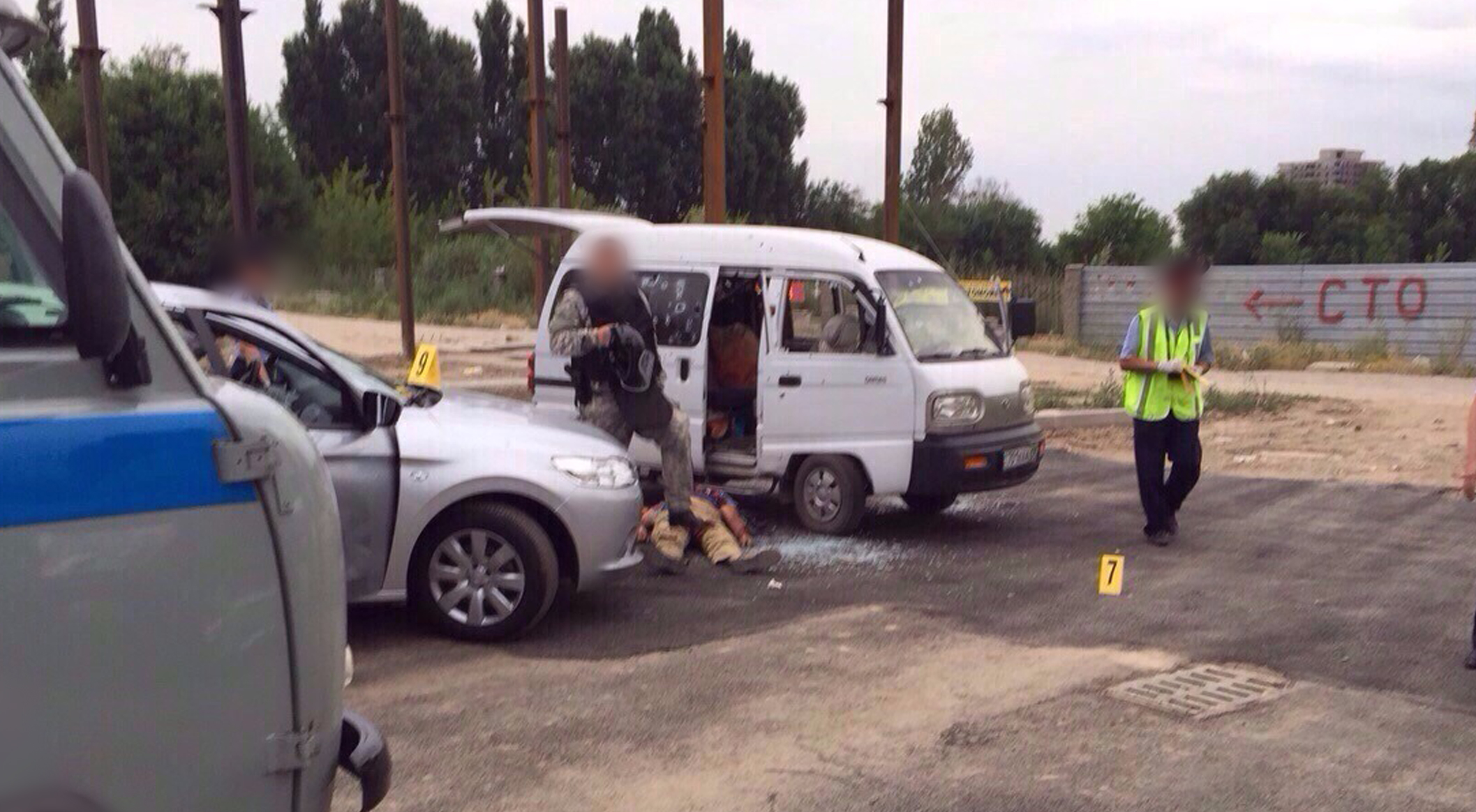 На кадрах видно, как бойцы спецподразделений заблокировали автомобиль преступников. Двери машины марки Daewoo Damas открыты, автомобиль блокирует служебный транспорт правоохранительных органов.