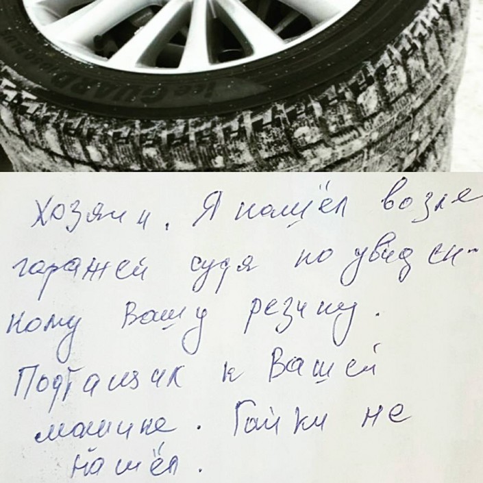 "Приехали оперативники и оформили заявление. Не особо надеясь на работу полиции, я начал искать диски и зимнюю резину на "Колесах". Договорившись, я приехал за новым комплектом колес. Именно в этот момент мне позвонили родные и сообщили, что возле моей машины лежат три колеса, похожие на украденные. Чудеса происходят! Оказалось, что их обнаружил таксист, который привез клиента в наш двор и увидел мою машину без колес. Когда клиент попросил подождать, таксист вышел из машины. Прогулялся и за гаражами случайно заметил спрятанные в углу три колеса. Он понял, что это колеса от машины, которая стоит во дворе. Прикатил их к машине. Не найдя хозяина, оставил записку с номером телефона", - продолжил владелец автомобиля.