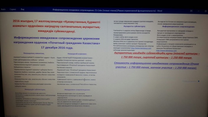 В письме говорится, что якобы кандидатура получателя за "вклад в развитие экономики" представлена на соискание премии. При этом, как заявляют организаторы, есть одно "но" - нужно всего-лишь "выложить" от 1,75 до 1,25 миллиона тенге. Подробный "прейскурант" услуг расписан в графе "Информационно-имиджевое сопровождение церемонии награждения орденом "Почетный гражданин Казахстана" 17 декабря 2016 года". В него входит "наградной комплект": орден из серебра и золота, удостоверение "почетного гражданина", часы, кортик, настенная плакетка - памятная или декоративная медаль, имеющая форму многоугольника. Также в "прейскуранте" прописаны встреча в аэропорту, размещение в гостинице, возможность пригласить до двух сопровождающих, экскурсии по Астане на лимузине, концертная программа со звездами, фото-, видеоотчет с мероприятия и размещение отчетов о каждом номинанте на официальном сайте мероприятия.