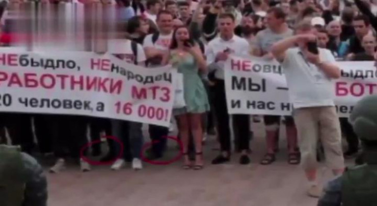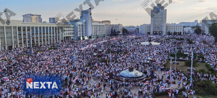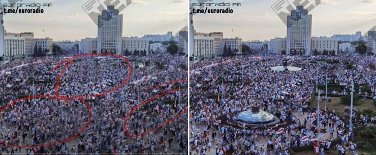После этого Михалков показал фотографию пустой площади Независимости в Минске "в мирное время", на которой отчетливо видны два фонтана. За ней последовал снимок все той же площади с толпой людей во время протестов. На фотографии при этом стоит логотип оппозиционного телеграм-канала Nexta, освещающего события в Беларуси.