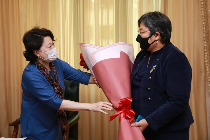 На встрече министр наградила Жанар Туребаеву знаком "Мәдениет саласының үздігі" за вклад в укрепление дружеских отношений между Казахстаном и Францией и развитие казахской культуры.