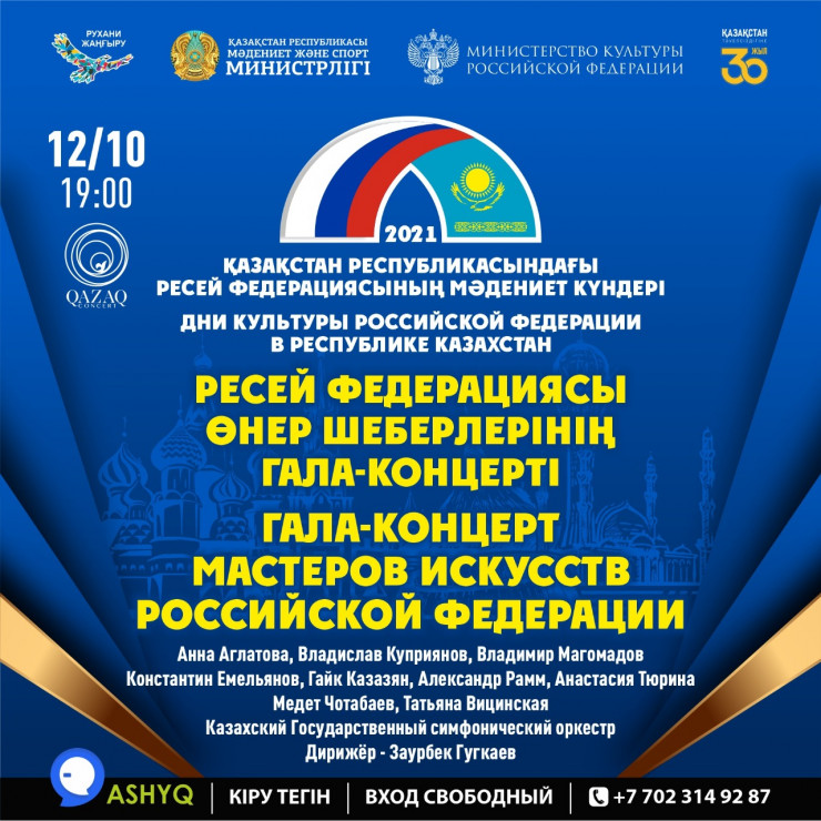 12 октября в 19.00 на сцене Центрального концертного зала QAZAQSTAN состоится гала-концерт ведущих российско-казахстанских исполнителей в сопровождении Казахского государственного симфонического оркестра. Дирижер – заслуженный артист Республики Северная Осетия – Алания Заурбек Гугкаев.