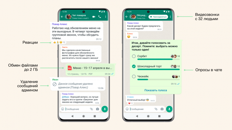К тому же разработчики добавили новые полезные функции в сами группы в мессенджере. Теперь у участников чатов появилась возможность создавать опросы в чате, осуществлять видеозвонки с участием до 32 человек и возможность создавать группы численностью до 1024 пользователей. Все эти функции можно использовать в любой группе (точно так же, как реакции со смайликами, обмен файлами большого размера и удаление сообщений администратором), но особенно полезны они будут для сообществ.