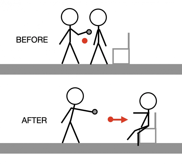 Для интерпретации результатов Аллен использовал простую физическую модель двух человечков, которых он назвал Брюсом и Джо. Сначала он исследовал центр масс системы "Брюс+Джо", который после удара сместился и начал двигаться в ту же сторону. Ключевую роль при этом сыграло трение: тот факт, что Брюс остался на месте, обеспечивает максимальный импульс, переданный Джо. Если бы демонстрация происходила на льду, эффект был бы слабее. Кроме того, трение вместе с силой удара создало крутящий момент, заставив не стоящего в стойке Джо падать назад (где его ждал стул).