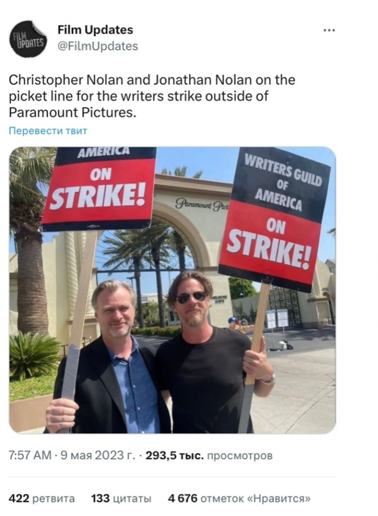 Как отмечает Мартин, присоединиться к протестующим он не смог, потому что находится не в Лос-Анджелесе. Но в забастовке Гильдии сценаристов США участвуют режиссер и сценарист Кристофер Нолан ("Начало", "Темный рыцарь", "Интерстеллар") и его брат, сценарист и режиссер "Мира Дикого Запада" Джонатан Нолан.