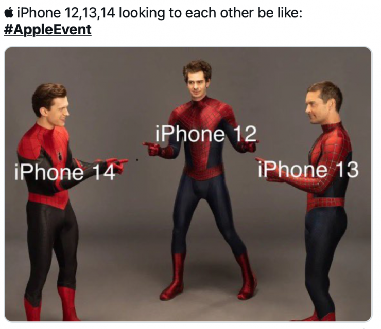 Культовый мем про Человека-паука, подчеркивающий сходства людей и предметов, конечно, поспешили применить и к iPhone 12, 13 и 14.