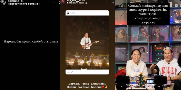 Свои соболезнования выразили известные знаменитости и певцы. Весть о скорой гибели артиста и вовсе повергла многих в состояние шока. О том, каким человеком был Дархан, в своих историях рассказали Say Mo, Yenlik, Куаныш Бейсеков и многие другие.