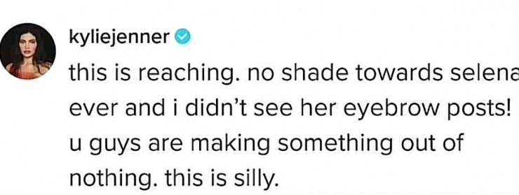 По всей видимости, поведение фанатов певицы разозлило Кайли: в своем блоге она поделилась "издевательским" снимком бровей. Это повлекло за собой массу обсуждений и скандал. Поклонники решили, что Дженнер таким образом решила посмеяться над Селеной Гомес, комплексующей из-за своей внешности.
