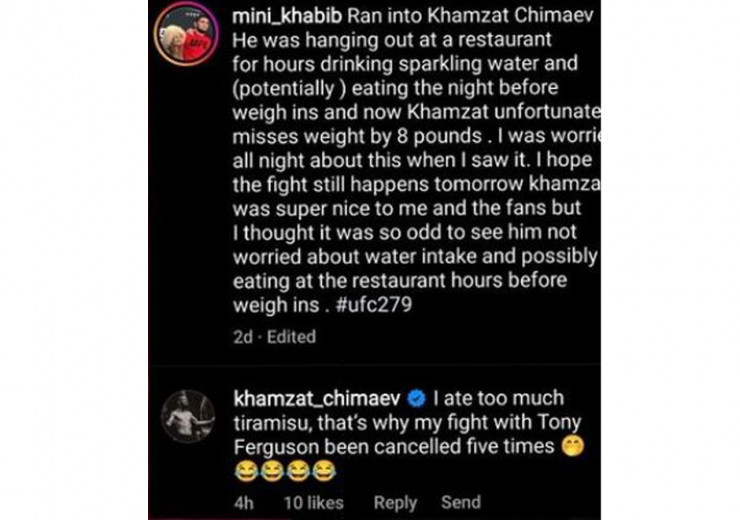 "Я просто съел слишком много тирамису, и поэтому мой бой с Тони Фергюсоном отменили пять раз. Мы свое уже сказали, пускай теперь скажет мир", - написал Чимаев в комментариях под публикацией известной в сети фанатки Хабиба Нурмагомедова.