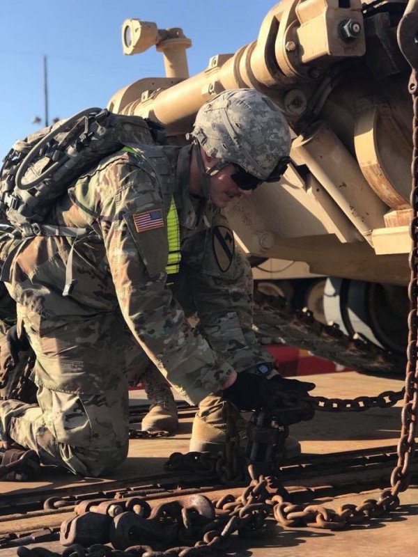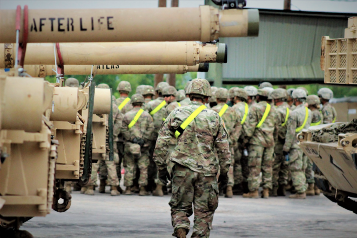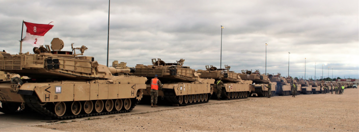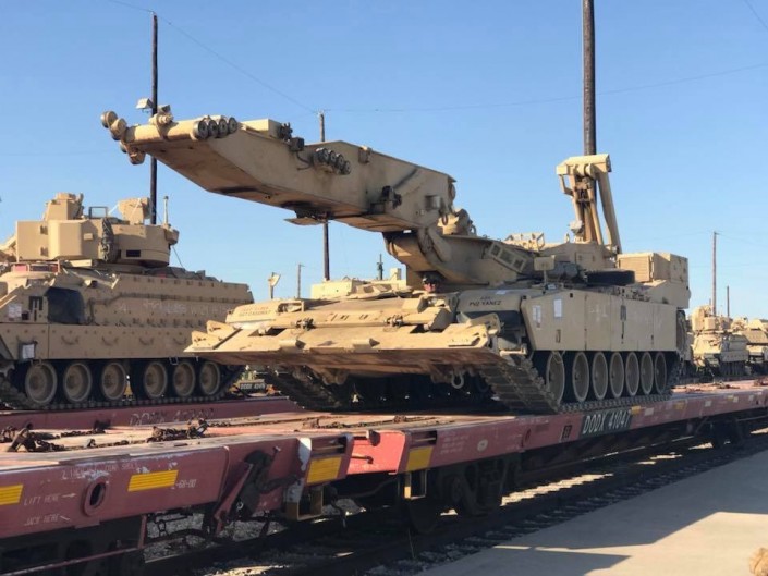 Фотографии и видео, на которых запечатлен поезд, загруженный американскими танками и направляющийся в сторону Польши, опубликованы в Twitter на странице первой кавалерийской дивизии, расквартированной в Форт-Худе.