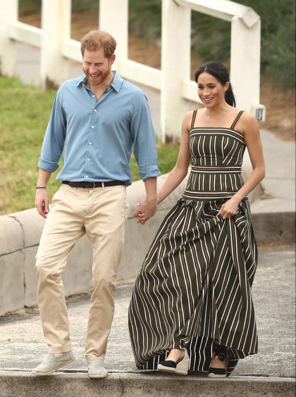 Беременная Маркл появилась на пляже Бонди в пригороде Сиднея в черных туфлях-эспадрильях на танкетке испанского бренда Castaner. Однако о том, что королева Великобритании Елизавета II терпеть не может туфли на танкетке, знают все женщины в королевской семье, в том числе и жена принца Гарри.