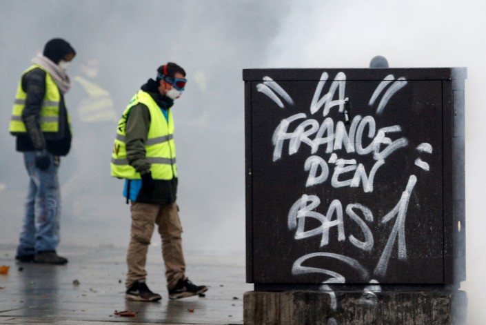 Протестующие идут среди слезоточивого газа во время столкновений вблизи площади де Л'Этуаль в Париже. Фото ©Reuters