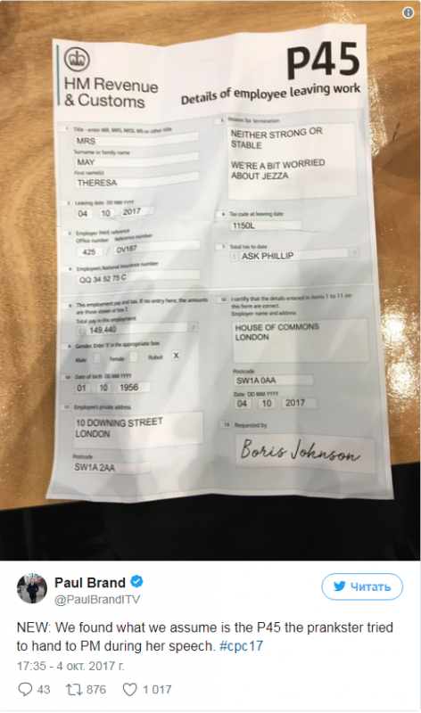 В Великобритании каждый работник получает налоговую форму P45 при увольнении. В бланке указываются полученные лицом доходы и уплаченные им налоги. Журналист Пол Бренд поделился в Twitter той самой формой, которую передали британскому премьеру: