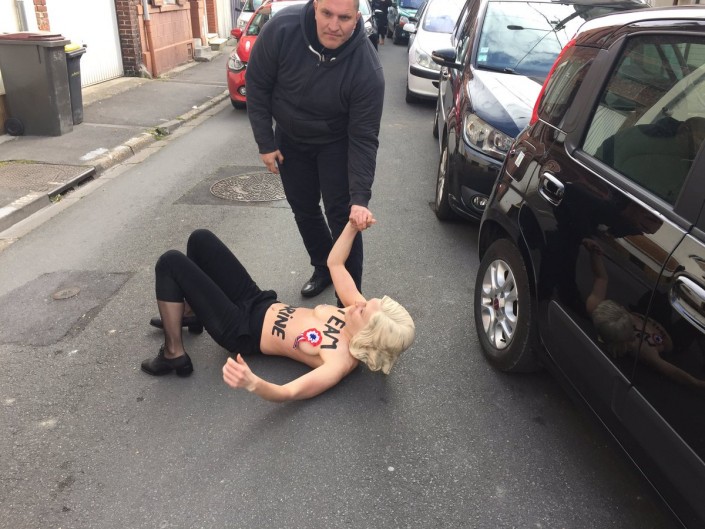 Именно в Энен-Бомоне чуть ранее проголосовала кандидат в президенты страны от партии "Национальный фронт" Марин Ле Пен. Несколько дней назад во время выступления в Париже представительница FEMEN уже пыталась раздеться перед Ле Пен.
