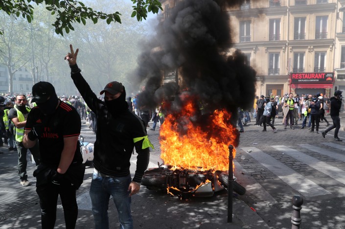 Несколько автомобилей и мопедов охвачены огнем на парижской улице, где днем в субботу, 20 апреля, проходит очередная акция протеста "желтых жилетов", передает Tengrinews.kz со ссылкой на РИА Новости.
