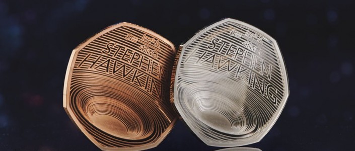 На монете номиналом в 50 пенсов помещено изображение черной дыры, сама монета выполнена в четырех вариантах: обычном коллекционном (стоимостью в 10 фунтов стерлингов), коллекционном из серебра (тиражом в 5,5 тысячи штук и стоимостью 55 фунтов), коллекционном из серебра повышенной толщины (тираж – 2,5 тысячи, стоимость – 95 фунтов стерлингов) и коллекционном из золота (тираж – 400 штук, стоимость – 795 фунтов).