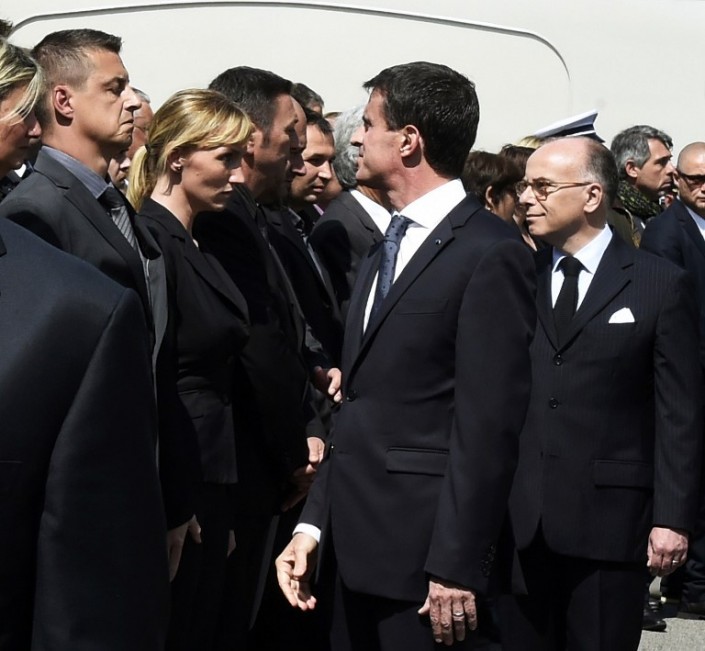 #HommageNational Au premier rang, un homme refuse de serrer la main. @fhollande passe outre, @manuelvalls s'énerve pic.twitter.com/chun5oSss5