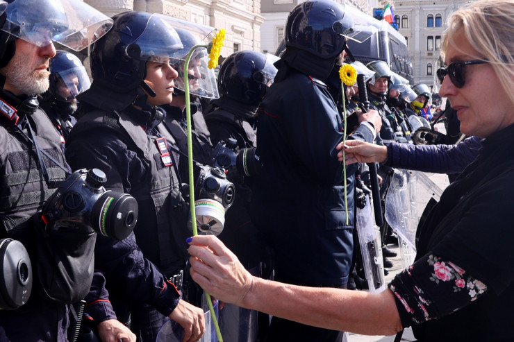 Протестующие собрались у одного из въездов в порт Триеста, они сели на дорогу и выкрикивали лозунги: "Такие, как мы, не сдаются" и "Свобода".