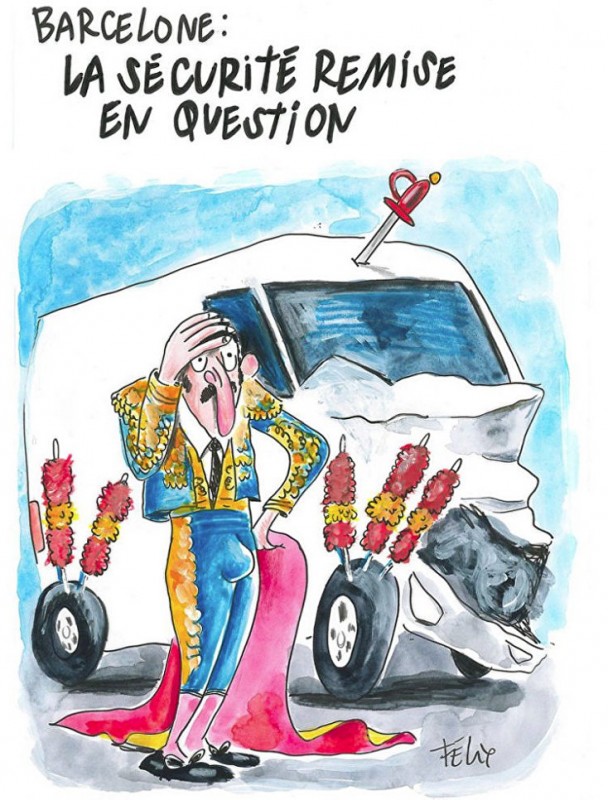 На рисунке, размещенном на сайте издания, запечатлен белый фургон с помятым капотом. Рядом с ним, держась за голову и сжимая в руке красное полотнище, стоит тореадор. В шины и крышу автомобиля воткнуты шпага и пики - инструменты участников корриды. "Барселона: безопасность снова под вопросом" - такая надпись сопровождает карикатуру.