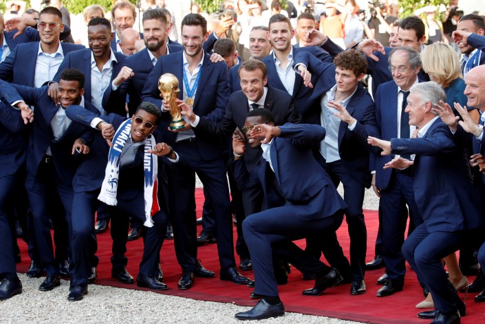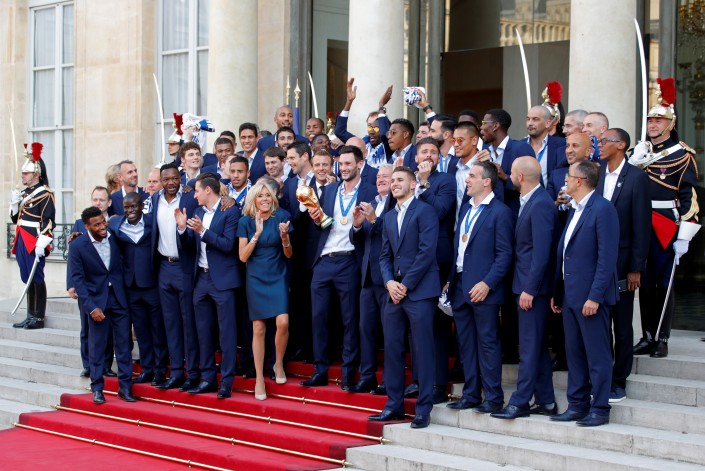 Сборную принял президент Франции Эммануэль Макрон с супругой Бриджит.