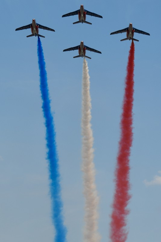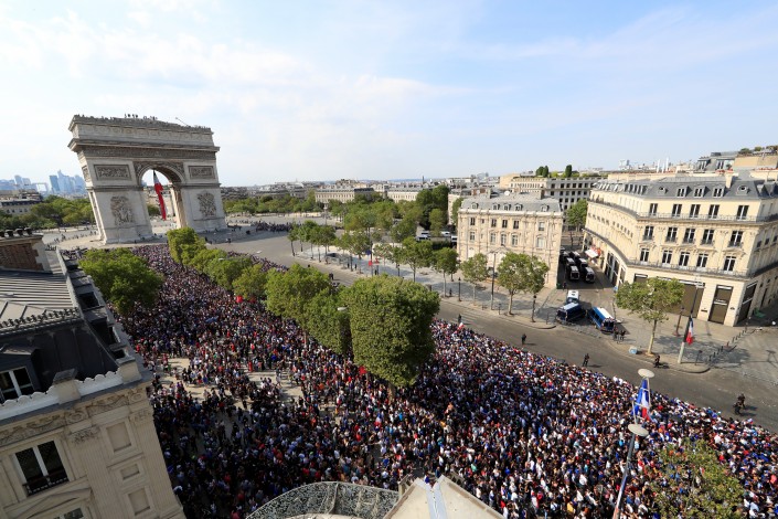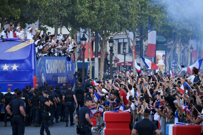 По данным французских СМИ, встретить сборную на улицы Парижа вышло около 300 тысяч болельщиков. А над городом пролетели самолеты, которые окрасили небо в цвета национального флага.