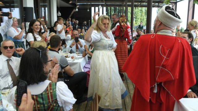 Путин сказал тост на немецком языке. "Дорогие брачующиеся! Уважаемая госпожа Кнайсль, уважаемый господин Майленгер, уважаемые дамы и господа! Для меня большая радость - возможность еще один раз посетить дружелюбную Австрию. Что меня особенно радует, так это повод, по которому мы все собрались в "зеленом сердце" Австрии, живописной Штирии. Разумеется, я имею в виду праздник по случаю свадьбы госпожи Кнайсль и господина Майленгера. Нет никаких сомнений, что все собравшиеся разделяют Ваши чувства в этот чудесный день и желают Вам семейного счастья и благополучия", - сказал он молодоженам.