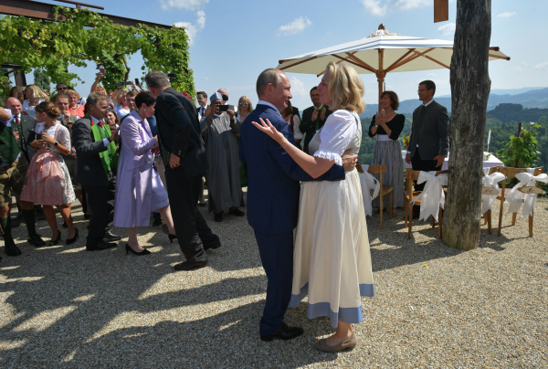 В субботу, 18 августа, Владимир Путин стал гостем на свадьбе министра иностранных дел Австрии Карин Кнайсль и финансиста Вольфганга Майлингера в Южной Штирии. Российский президент вручил невесте букет цветов, потанцевал и произнес тост. Видео поздравления опубликовал телеканал REN-TV.