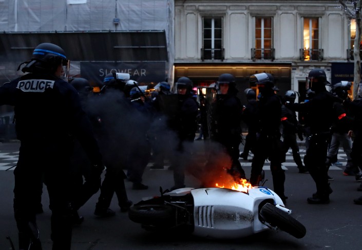 Как сообщает телеканал BFMTV, беспорядки произошли и на бульваре Сен-Жермен, где участники акции попытались установить баррикады, поджигая их.