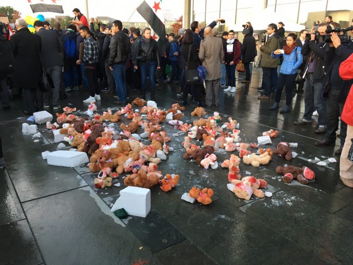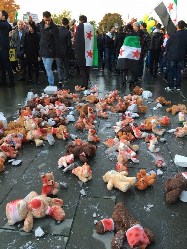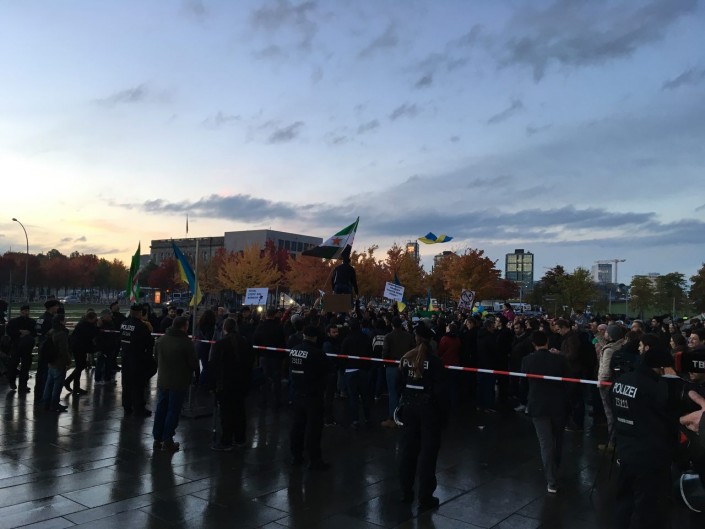 Президента России Владимира Путина, прилетевшего вечером 19 октября в Берлин на "Нормандские переговоры", встретила группа протестующих с украинскими и сирийскими флагами. В руках они держали плакаты: "Путин, хватит бомбить Сирию", "Стоп, Путин", "Путин-террорист". Об этом сообщает Tengrinews.kz.