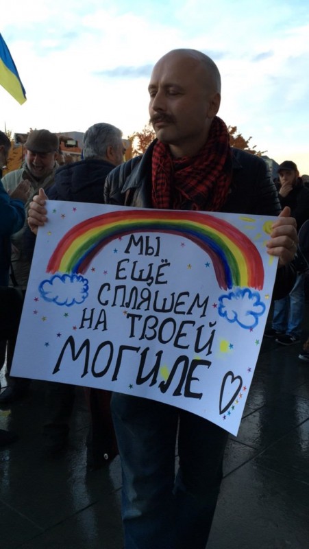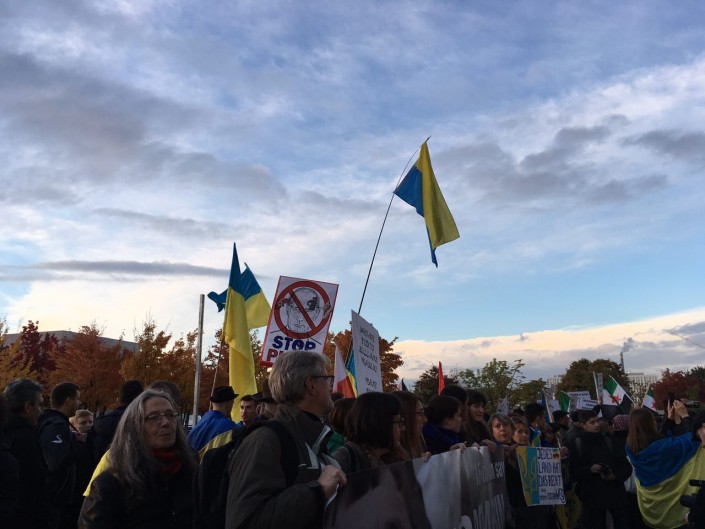"Путин является главным спонсором войны на Украине и спонсором террористов. Мы выступаем против этого. Мы хотим остановить войну. Если бы не было оружия и наемников, то никакой войны в Донбассе бы не было", - заявил участник акции протестов Павел Литковский. По его словам, сам он родом из Украины, уже два года живет в столице Германии.
