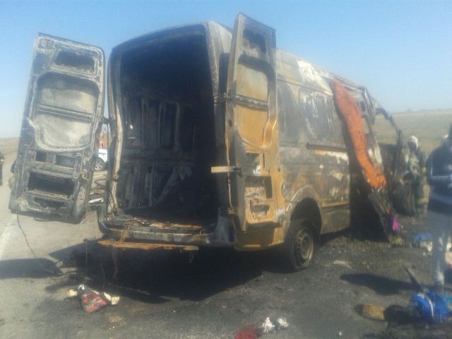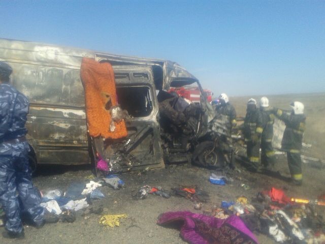 В результате столкновения транспортные средства загорелись, на месте пожара были обнаружили 14 сгоревших тел. Среди погибших на месте оказались водитель автомашины "Газель" и 13 пассажиров микроавтобуса Mercedes-Benz Sprinter (трое из них - дети), сообщает пресс-служба ведомства.