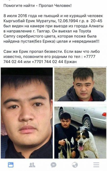 По словам родственников, 8 июля в 20.45 автомобиль парня был снят камерой наблюдения при выезде из Алматы в направлении Талгара. Он выехал на автомобиле марки Toyota Camry, которая позже была найдена без водителя.