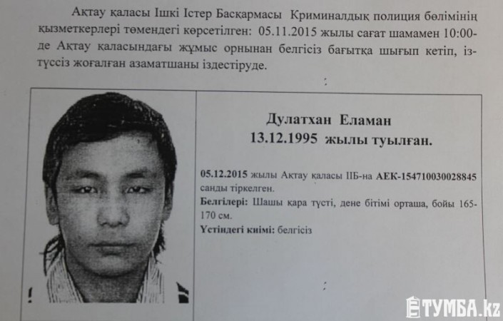 Разыскивать сына из Павлодара приехал его отец Жанат Даулатхан. Он рассказал, что его сын, Еламан Даулатхан, родившийся 13 декабря 1995 года, служил в морской пехоте. В Актау он снимал квартиру. В последний раз его видели 5 ноября 2015 года. С тех пор родители ничего не слышали о сыне. С заявлением о пропаже они обратились в УВД города Актау.