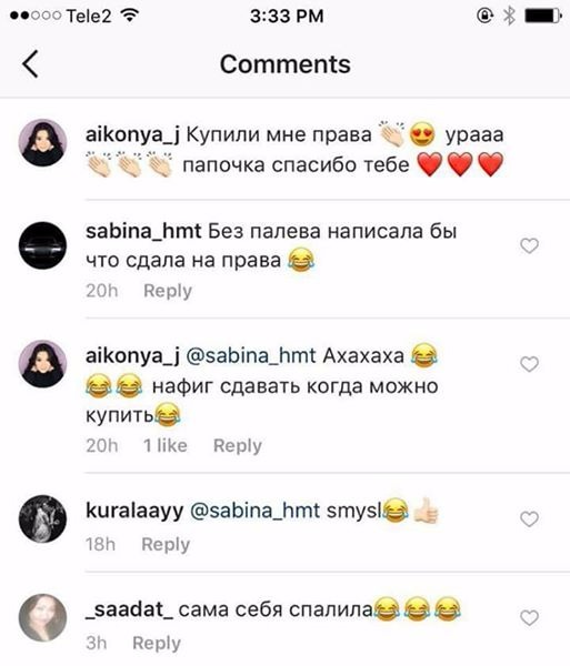 Напомним, фотографию в социальной сети Айгерим выложила с надписью "Купили мне права, урааа папочка спасибо". Позже отец рассказал, что девушка получила права в Алматинской области и сама сдавала экзамен. С его слов, якобы официальную госпошлину в размере 1,25 МРП (2 836 тенге) за права она восприняла как покупку.
