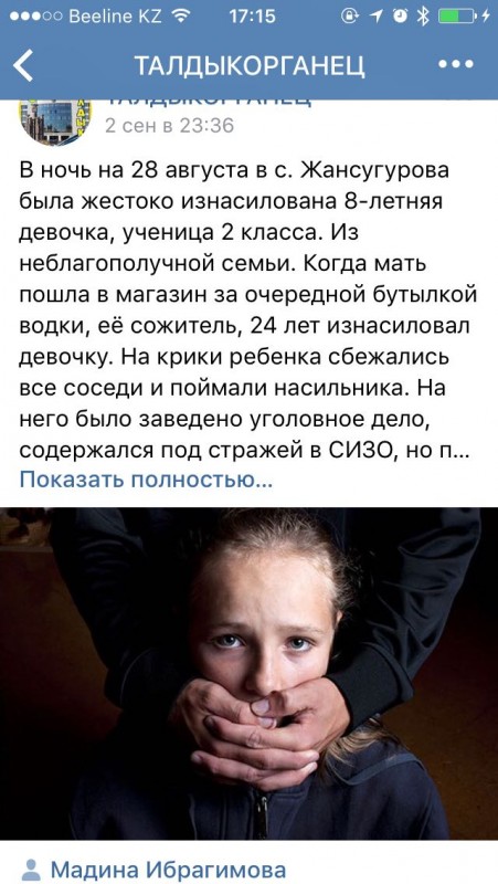 "В ночь на 28 августа в селе Жансугурова была жестоко изнасилована восьмилетняя девочка, ученица второго класса. Она из неблагополучной семьи. Когда мать пошла в магазин за очередной бутылкой водки, ее 24-летний сожитель изнасиловал девочку. На крики ребенка сбежались все соседи и поймали насильника. На него было заведено уголовное дело, содержался под стражей в СИЗО, но после встречного заявления от матери девочки его выпустили. Мать забрала заявление в обмен на ремонт дома. А как же ребенок?! Все жители нашего поселка возмущены. Просим защитить права ребенка", - говорится в обращении.