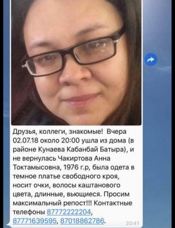 Он добавил, что на видеозаписи с камер наблюдения из аптеки видно, в какой одежде она была в последний раз. По словам Нугманова, она вышла из дома в этой же одежде. Родные Анны Чакиртовой просят всех, кто владеет какой-либой информацией, связаться по телефону: +7 707 272 0945.
