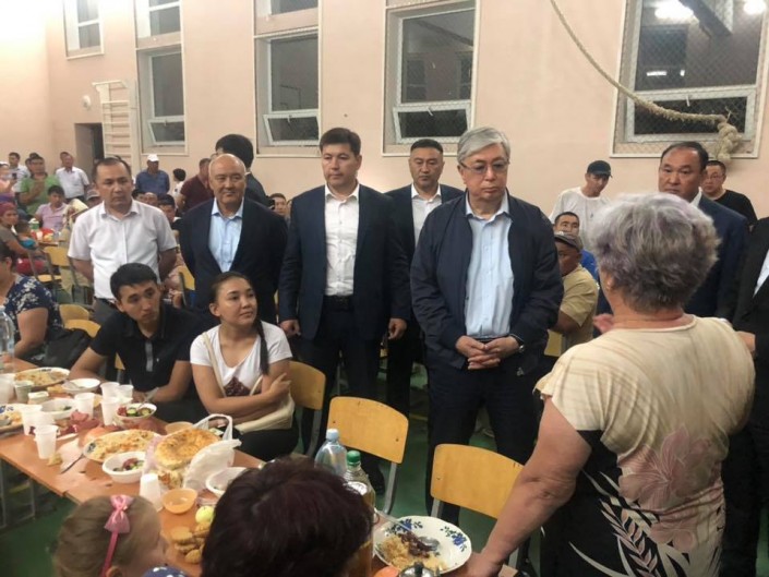 "Барлығы жақсы болады, шыдай тұрыңыздар. Бұл төтенше жағдай, апат. Үкімет ақша бөледі. Көмектеседі, уайымдамаңыздар. Жөндеу жұмыстарын жүргіземіз. Мен арнайы келдім", - дейді Президент дастархан басында отырғандарған. Мемлекет басшысының сөзінен кейін отырғандар қошеметтеп, алғыс айтады.