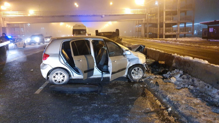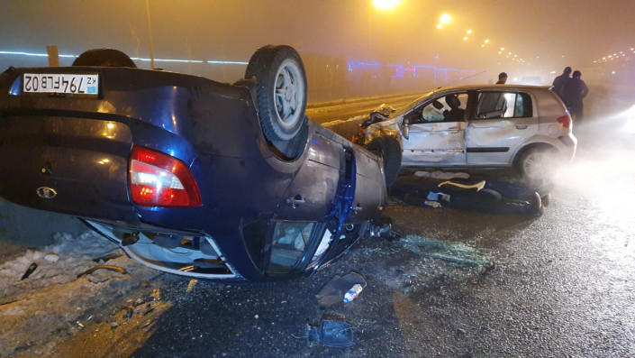 Столкновение двух легковых автомобилей Hyundai Getz и LADA Granta произошло напротив рынка "Акбулак" (район барахолки). После столкновения LADA Granta опрокинулась на крышу.