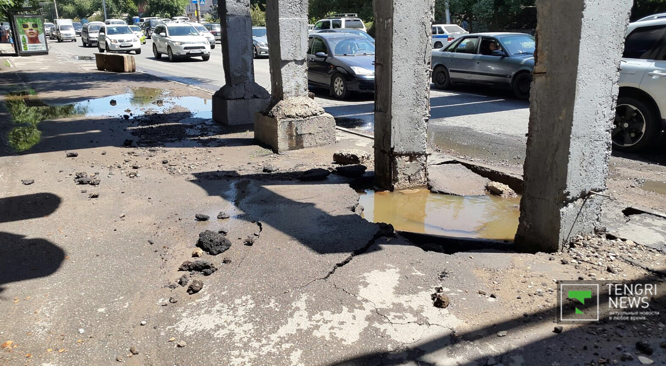 Авария на трубопроводе произошла на проспекте Сейфуллина, неподалеку от пересечения с проспектом Райымбека в Алматы, передает корреспондент Tengrinews.kz. Сообщается, что струя воды хлынула из трубопровода, проходящего над дорогой. По некоторым данным, воду пустили в обрезанную трубу по ошибке. Движение на участке затруднено. Также в результате случившегося был поврежден асфальт на тротуаре. По состоянию на 11.50 водоснабжение на данном участке было перекрыто, ведутся работы по устранению последствий аварии.
