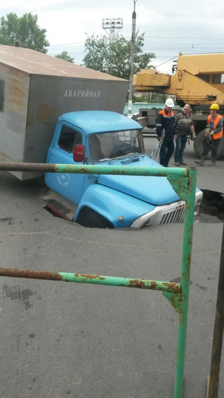 Инцидент произошел в районе улиц Катаева - Ломова во время гидравлических испытаний на тепловых сетях. Передняя часть аварийной машины почти на метр ушла под асфальт.